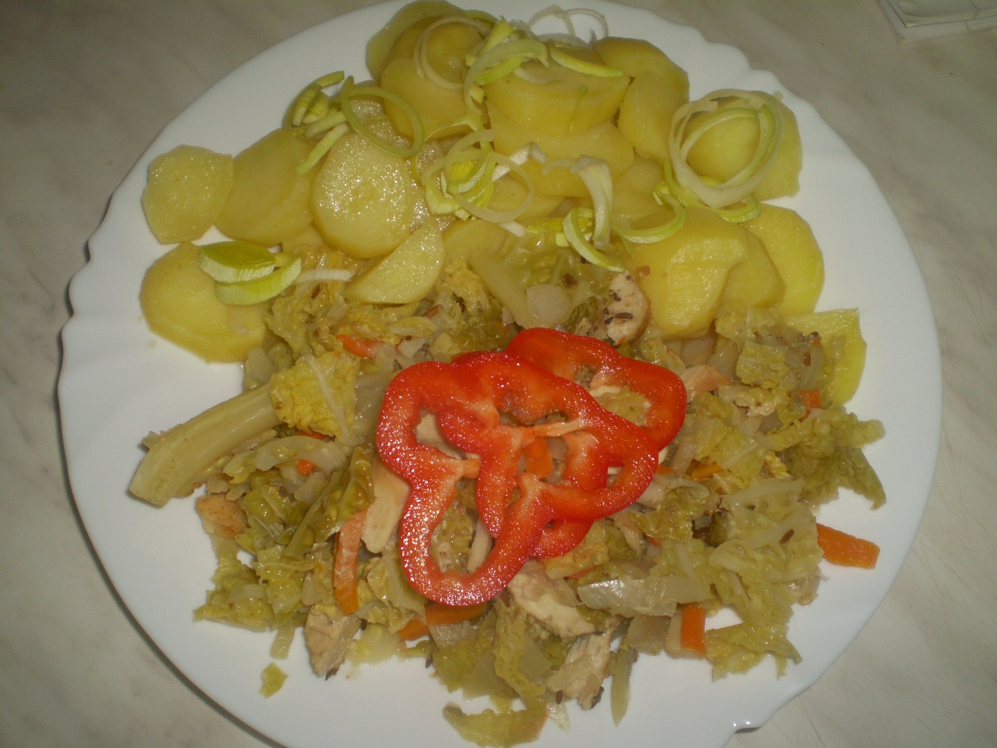 Kapustu, maso, cibuli a polovinu oloupaného česneku nakrájíme na kousky, vše dáme do pekáče, nasypeme mraženou zeleninu, utřeme zbylou polovinu česneku a přidáme.
