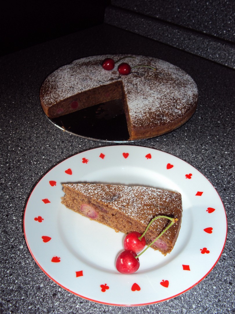 Všechny suroviny smícháme v řidší těsto, rozetřeme ho do koláčové formy a hustě poklademe třešněmi.