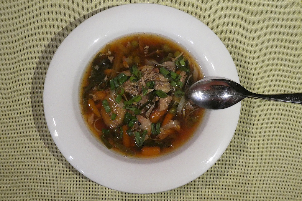 Zázvor nakrájíme na plátky, chilli papričku nadrobno, jarní cibulky překrájíme tak asi na 5 cm dlouhé kousky. Do vývaru přidáme opraná kuřecí horní stehna. Přidáme zázvor, nakrájenou chilli papričku, nakrájenou pálivou zelenou papriku, jarní cibulku a celou skořici.