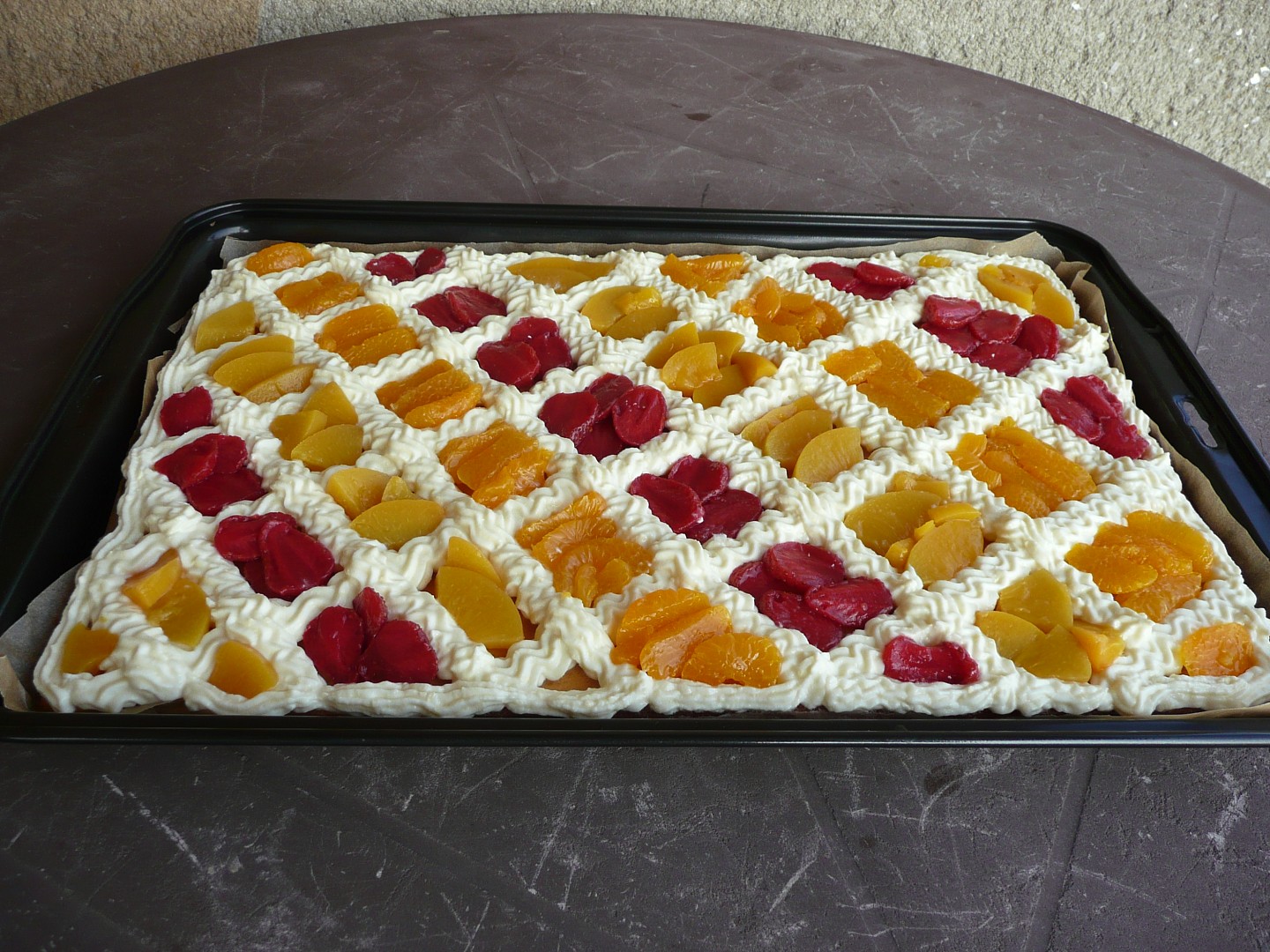 Piškotový plát potřete marmeládou a sáčkem s ozdobnou trubičkou nastříkejte na jeho povrch hustou krémovou mřížku.