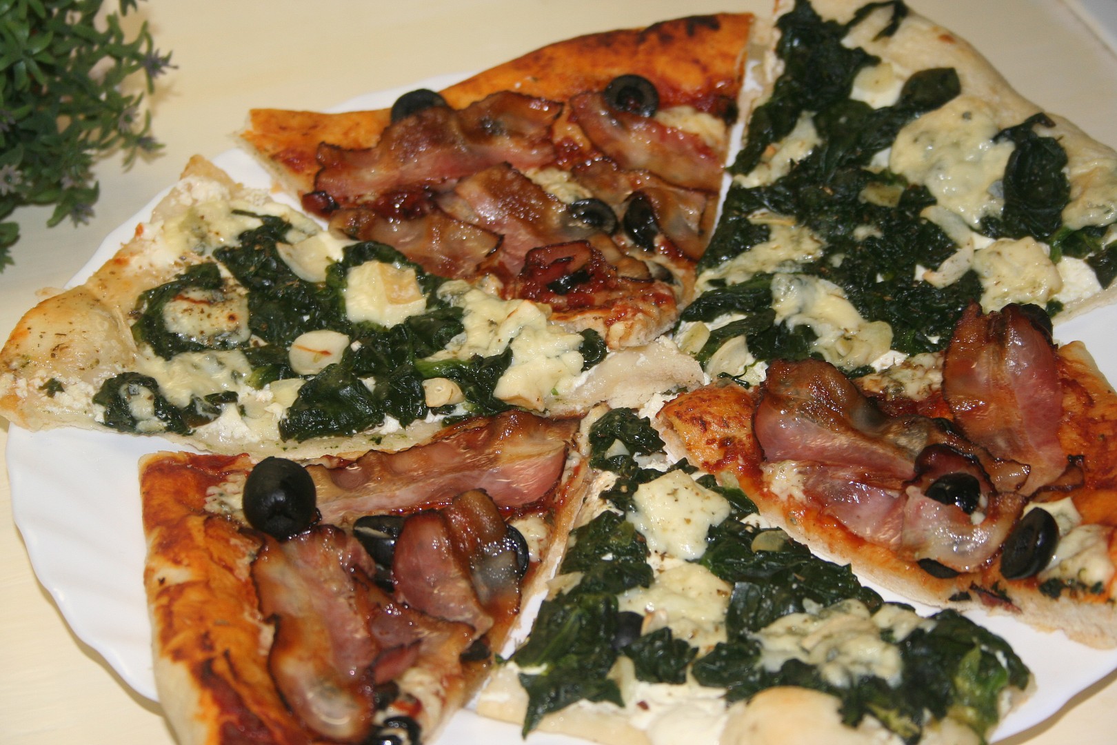 Toto těsto vyjde na 2 velké pizzy (2 plechy). Potřeme směsí oleje a kečupu, dáme ingredience, kdo co rád, posypeme sýrem a dáme péct cca 25 minut na 200°C.