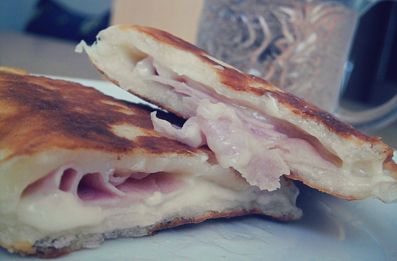 Těsto poté vyválíme na tenké placičky a naplníme je šunkou a sýrem.