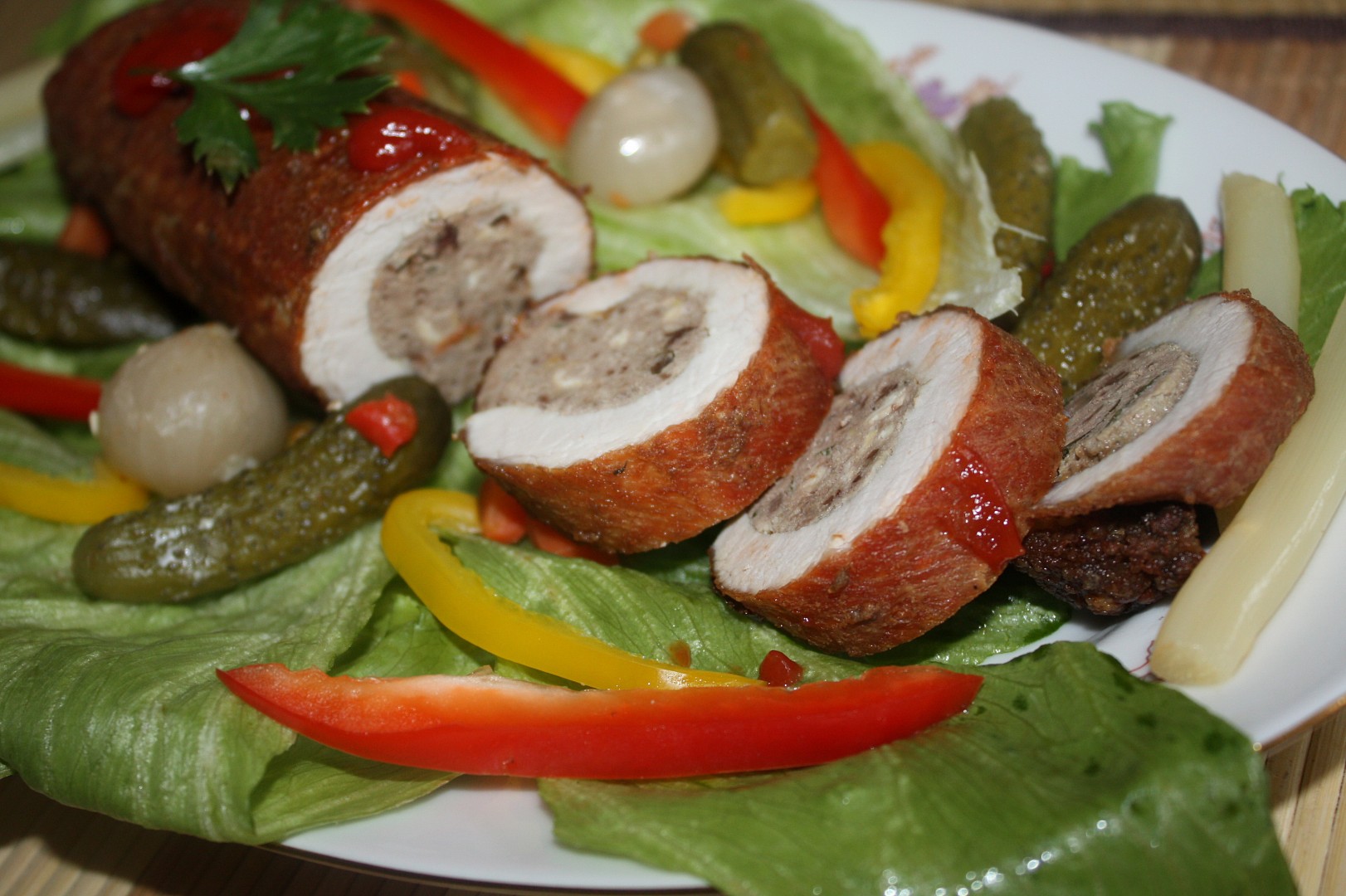 Nádivku rozetřeme na plát, sbalíme, ovážeme a dáme na olej péci. Nejdříve ze všech stran na plotýnce, potom podlijeme a dáme do horké trouby. Podáváme s bramborovou kaší.