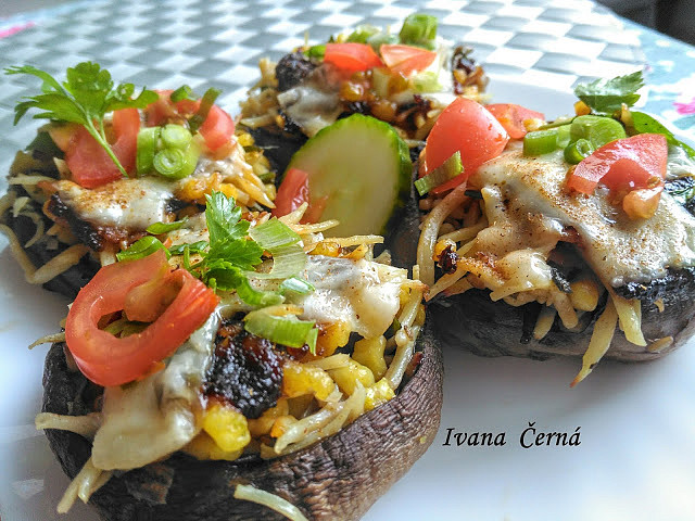 3. Ke konci pečení položíme na každý houbový klobouček proužky ementálu. Pečeme, dokud se sýr neroztaví. Podáváme s rajčátky a salátem.