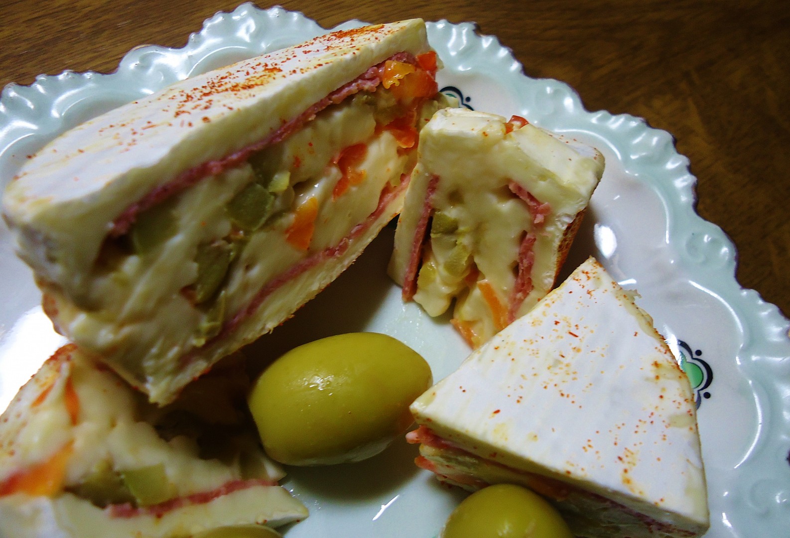 2. Vnitřek sýru pak v misce promíchejte s posekanými olivami. Zelené olivy doplňte třeba posekanými sterilovanými paprikami, černé petrželovou natí a podobně. Do vybraných hermelínových „misek“ pak vmáčkněte silnější kolečko salámu a vložte zpět sýr s olivami.