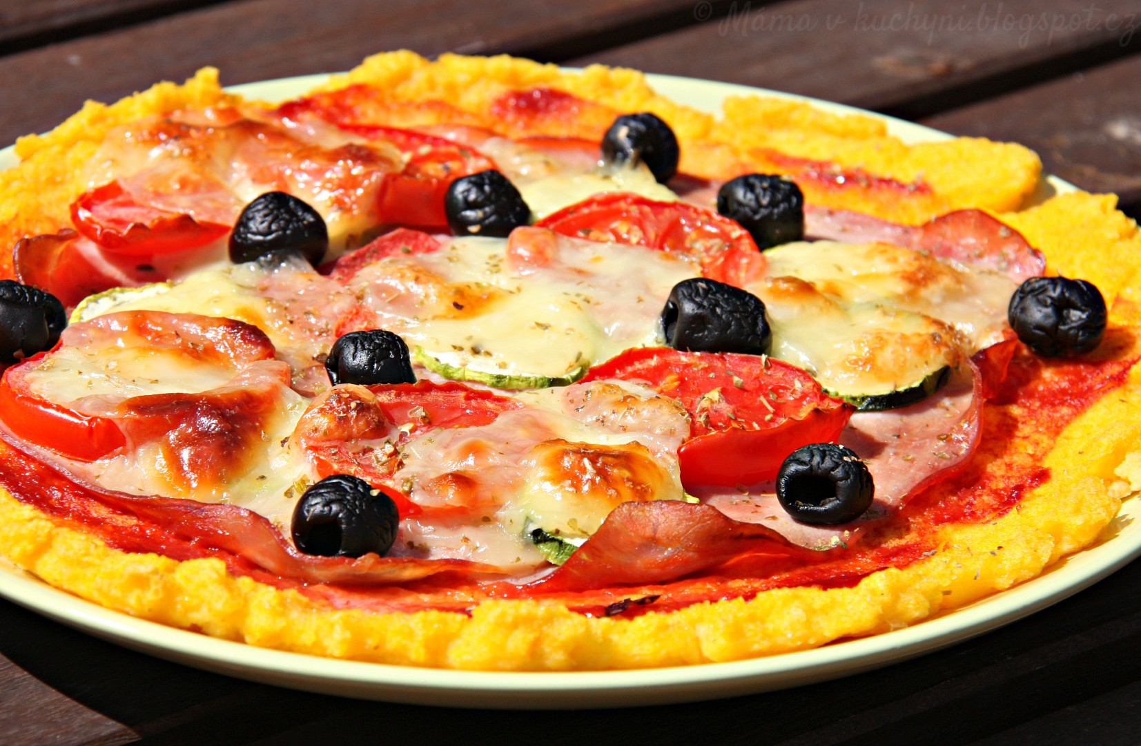 Kaši ještě dosolte a poté rozetřete na plech vystlaný pečícím papírem, a to na vrstvu silnou přibližně 1 centimetr. Dále potřete pasírovanými rajčaty a přidejte vše, co máte na pizze rádi. Zde jsem použila farmářskou šunku, rajčata, cuketu, olivy a mozzarellu. Navrch jsem posypala oreganem.