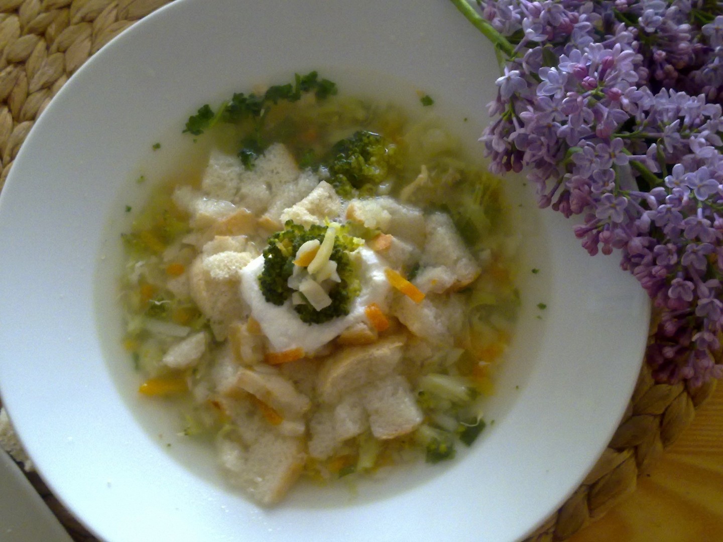 5. Ozdobila jsem polévku pak pažitkou a podávala jsem ji s osmaženým rohlíčkem.