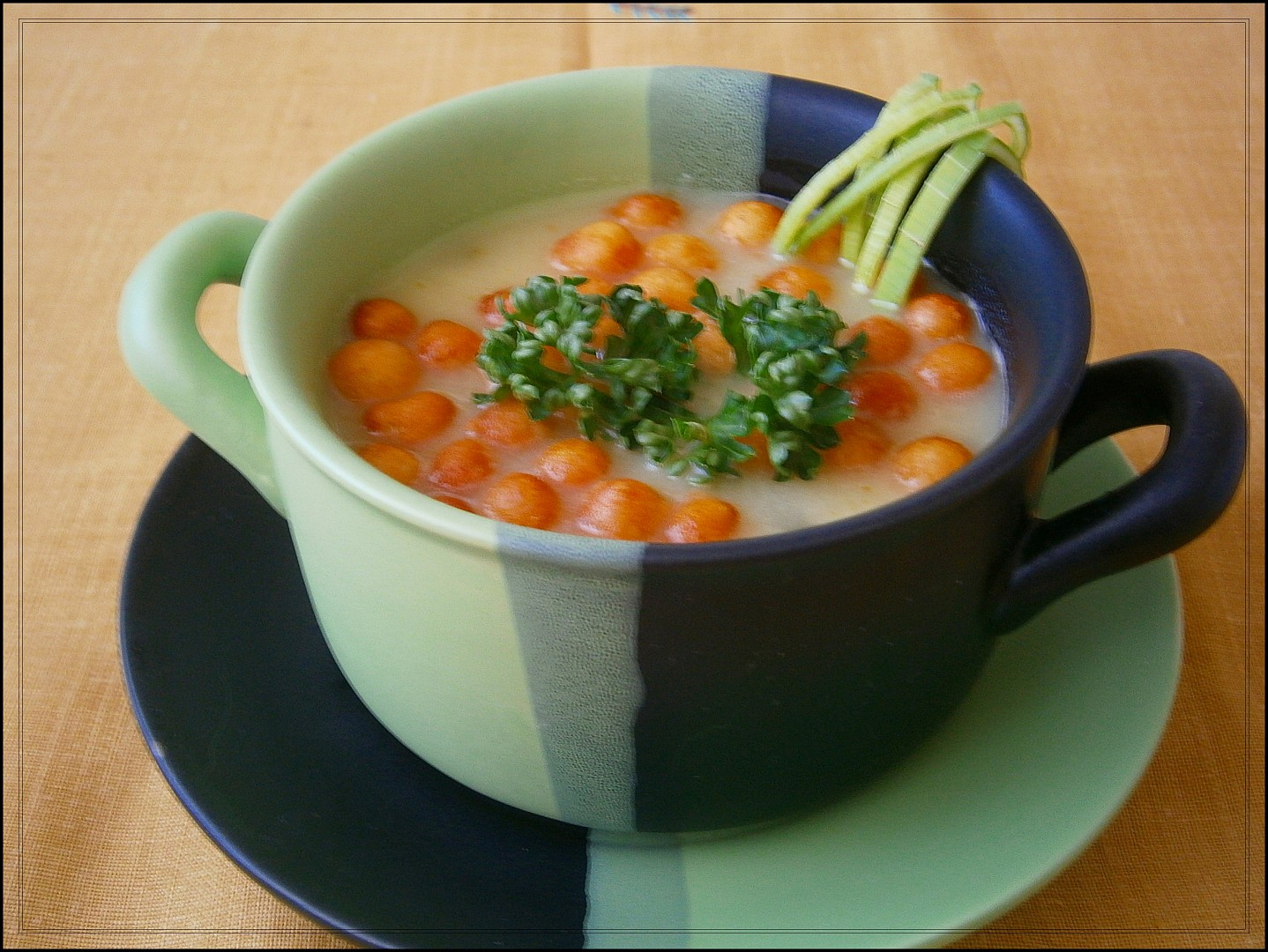 Podáváme se smaženým hráškem viz foto, nebo se staršími rohlíky nakrájenými na kostičky a osmaženými v pánvi na troše oleje nebo másla.