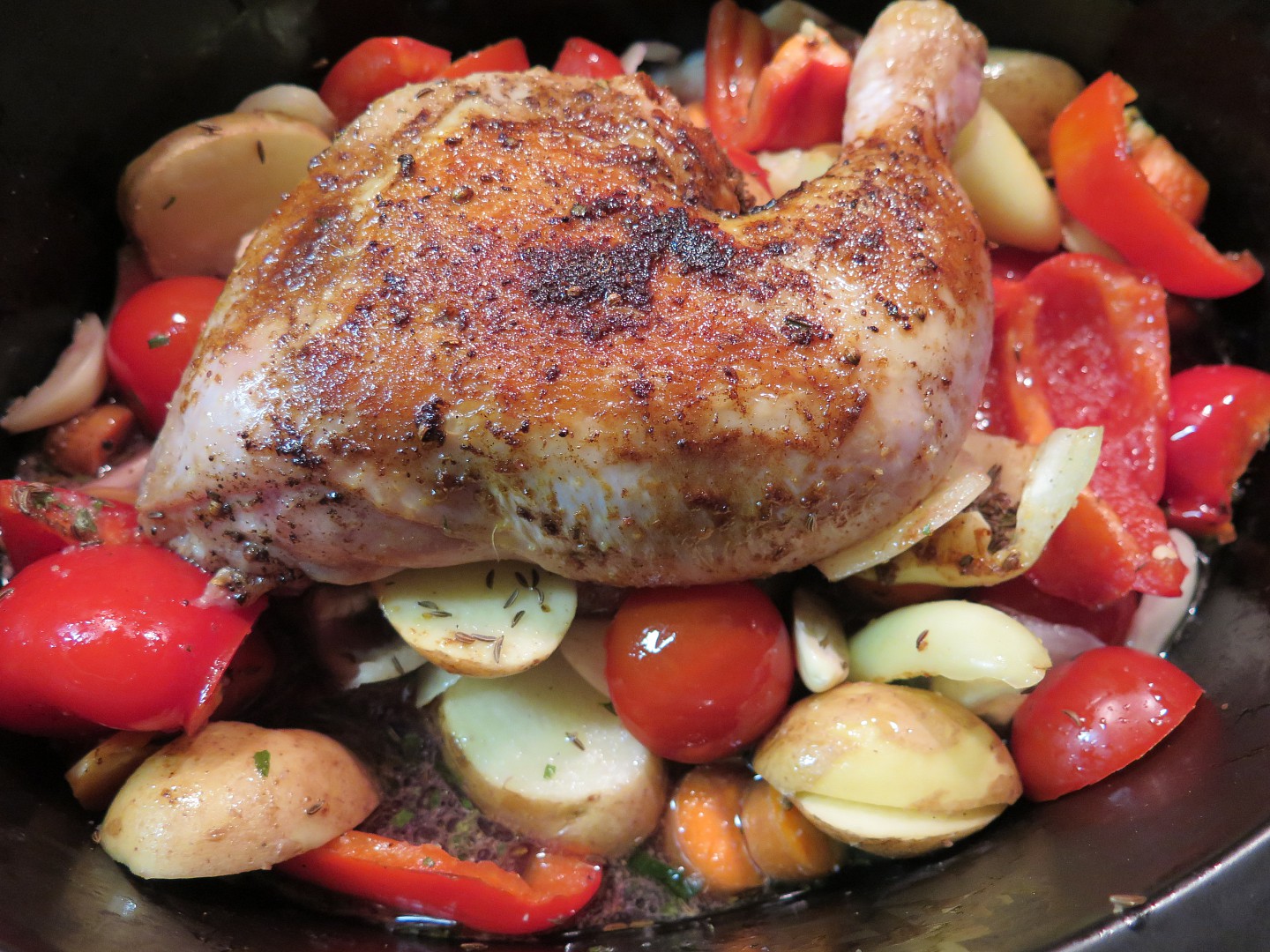 Do pomaláku vložíme zeleninu okořeněnou pepřem, kmínem, chilli, solí, na ni položíme čtvrtku, podlijeme vývarem jen do výše zeleniny a pomalíme na rychlém stupni (II.) 3 hodiny.