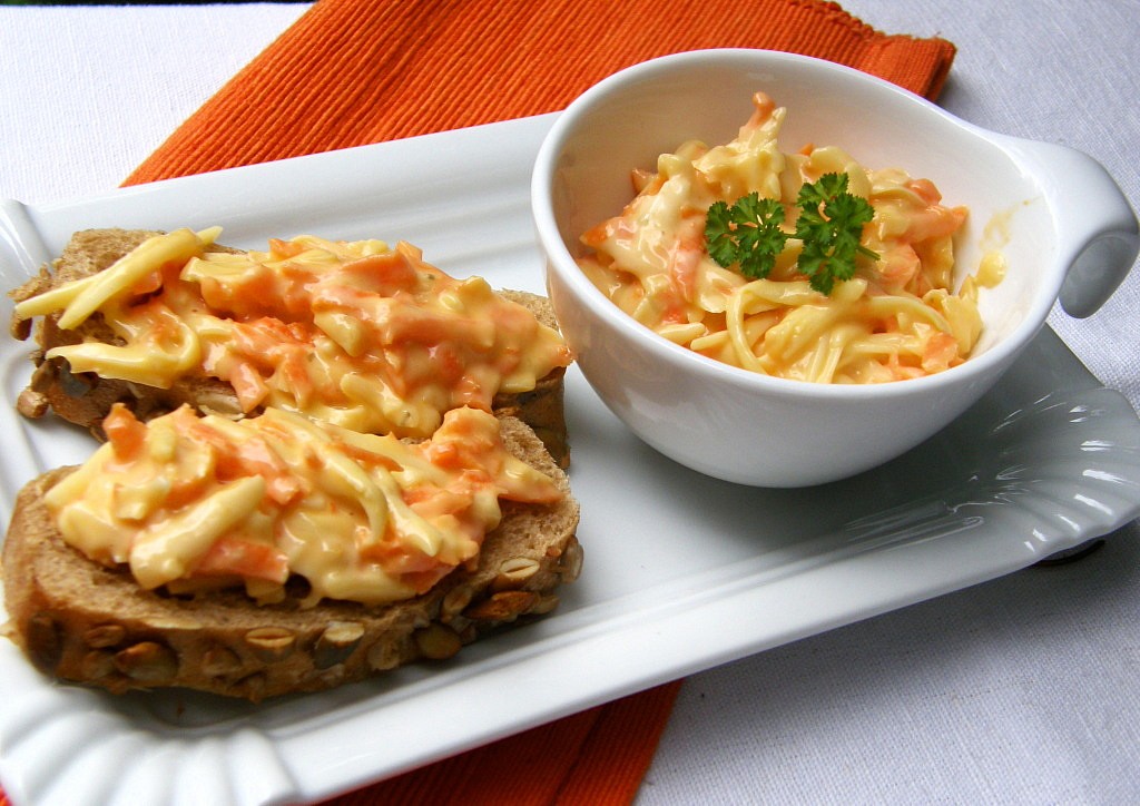 Mrkev a sýr nastrouháme najemno, přidáme jen takové množství majonézy, aby se suroviny spojily.