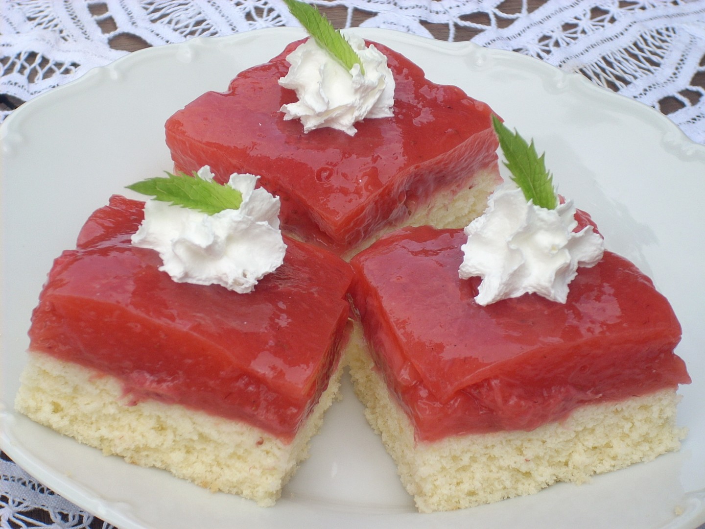 2. Očištěné a na půlky pokrájené jahody podlejeme asi 3 lžícemi vody a prudce je asi 3 minuty vaříme. Ve zbytku vody si rozmícháme pudinkové prášky a zavaříme do jahodové hmoty. Uvařený pudink ještě horký klademe lžící (aby se nestačil roztékat) na teplý piškot.
