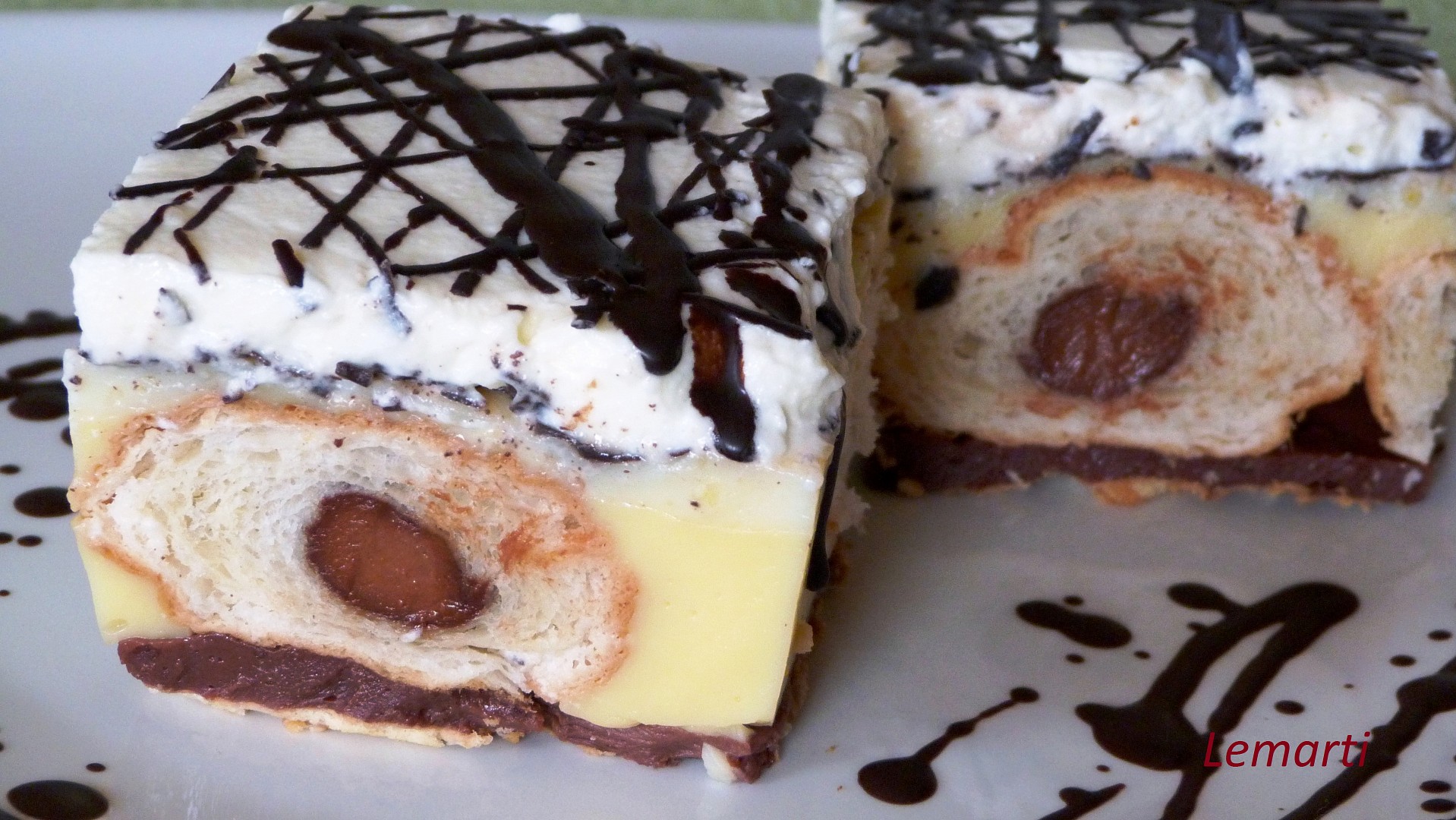 Ze zbylého mléka a cukru uvaříme pudink a ještě horkým zalijeme croissanty. Na pudink nalijeme čokoládovou polevu. Vrch koláče po vychladnutí natřeme vyšlehanou šlehačkou s trochou cukru.