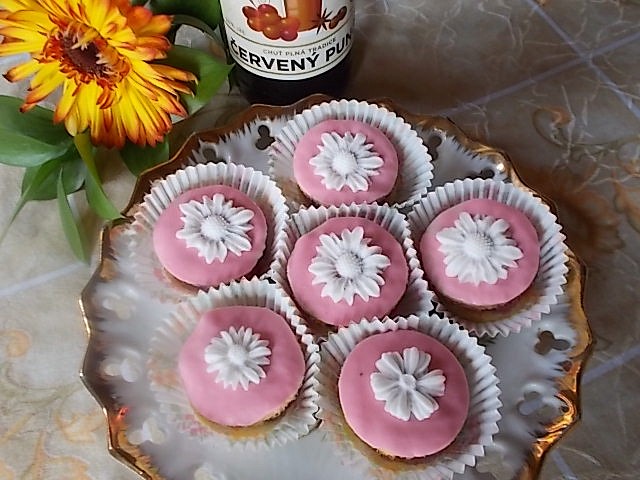 Povrch znovu potřeme džemem a přilepíme kolečko vykrojené z fondánu a ozdobu.