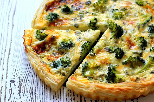 Brokolici rozebereme na růžičky a krátce ji spaříme horkou vodou. Listovým těstem vyložíme koláčovou formu a dno propícháme na několika místech vidličkou.
