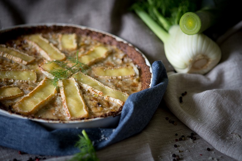 Fenykl nakrájejte na jemné plátky (bulvu rozkrojte napůl, vykrojte tvrdý střed a poté krájejte na jemno). Fenyklem rovnoměrně poklaďte těsto.