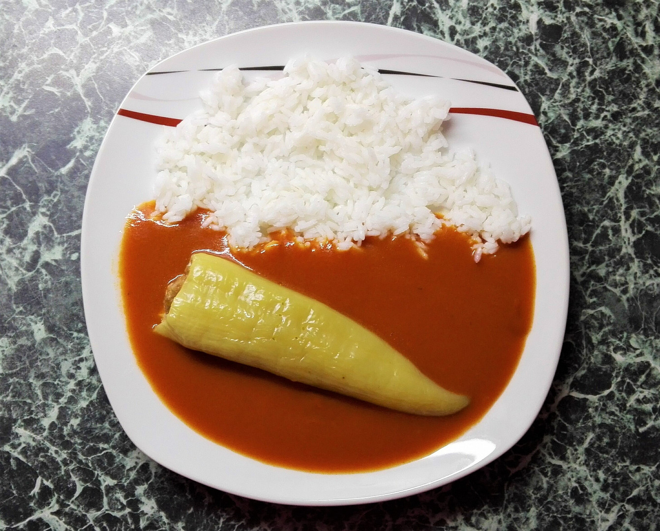 Směsí naplníme papriky. Papriky dáme na plech a podlijeme vodou. Pečeme na cca 160-170°C, dokud není maso hotové a papriky měkké (trvá to cca 40-45 minut).