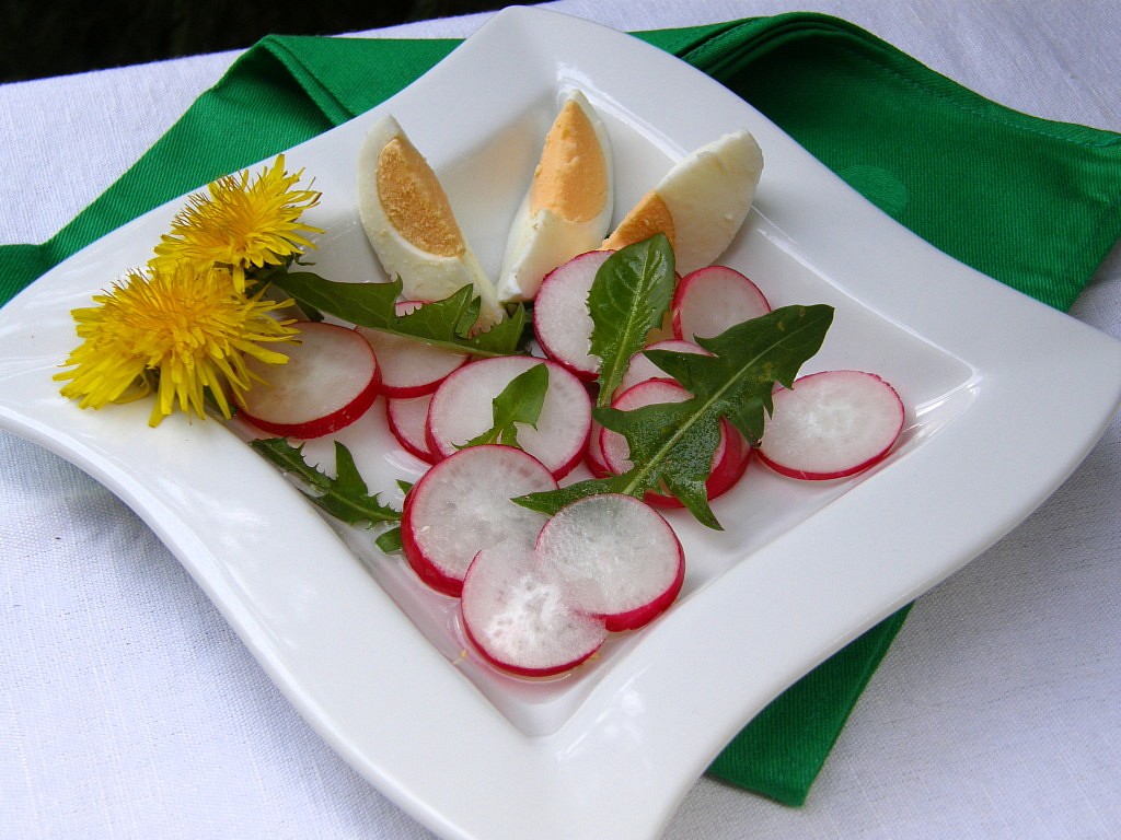 Ředkvičky důkladně omyjeme a nakrájíme na tenké plátky. Lístky pampelišky omyjeme a osušíme.