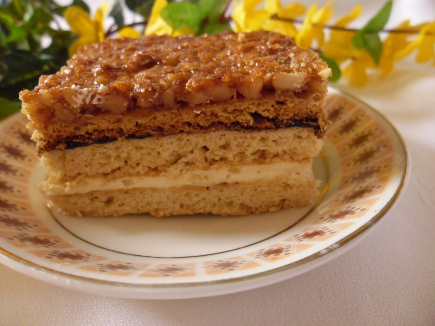 Rozpustíme na pánvi máslo, med a cukr, přidáme ořechy a do zlatova posmažíme, hmotu co nejrychleji rozetřeme na třetí placku a dáme péct – hlídáme aby při pečení hmota příliš neztmavla. -