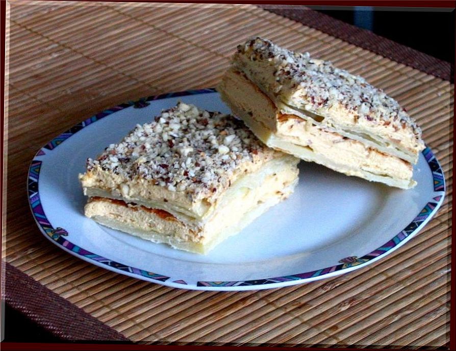 Po vychlazení placku potřeme polovinou krému, na ní položíme druhou, potřeme zbytkem krému. Povrch posypeme mletými ořechy, které mírně zatlačíme do krému. Necháme v lednici vychladit a uležet.