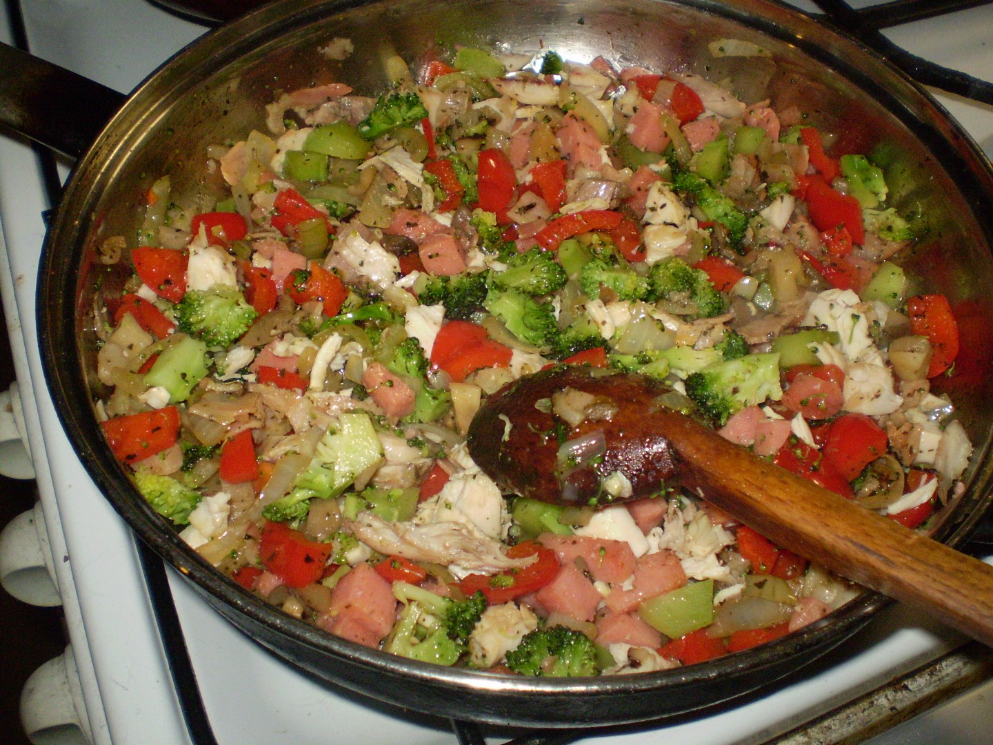 3. Ostatní ingredience si nakrájím, přidám k cibuli a zasypu kořením, dusím a přileju nějakou decku kuřecího vývaru, nebo vody.