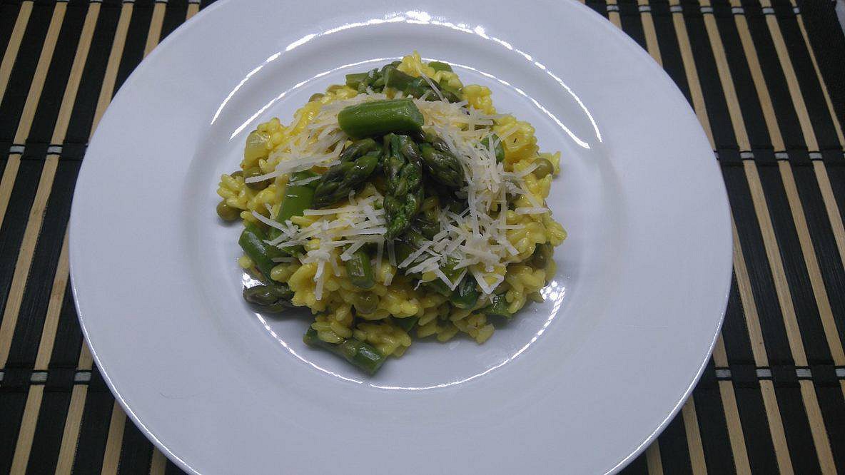 Poté rýži zalijeme vínem a mícháme, dokud se víno nevstřebá. Podléváme po částech chřestovým vývarem a vaříme, dokud není rýže měkká a krémová. -