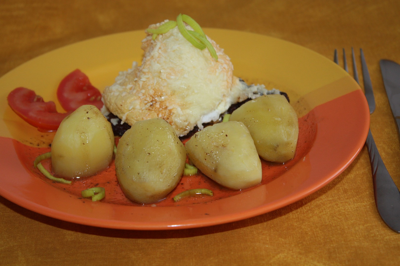 1. Roštěnky naklepeme, nařízneme, osolíme, opepříme a na rozpáleném tuku zprudka opečeme. Měkké maso narovnáme do vymazaného pekáčku, každý plátek zakryjeme kopečkem ušlehaného sněhu z bílků, mírně osolíme, posypeme strouhaným sýrem a v troubě zapečeme.