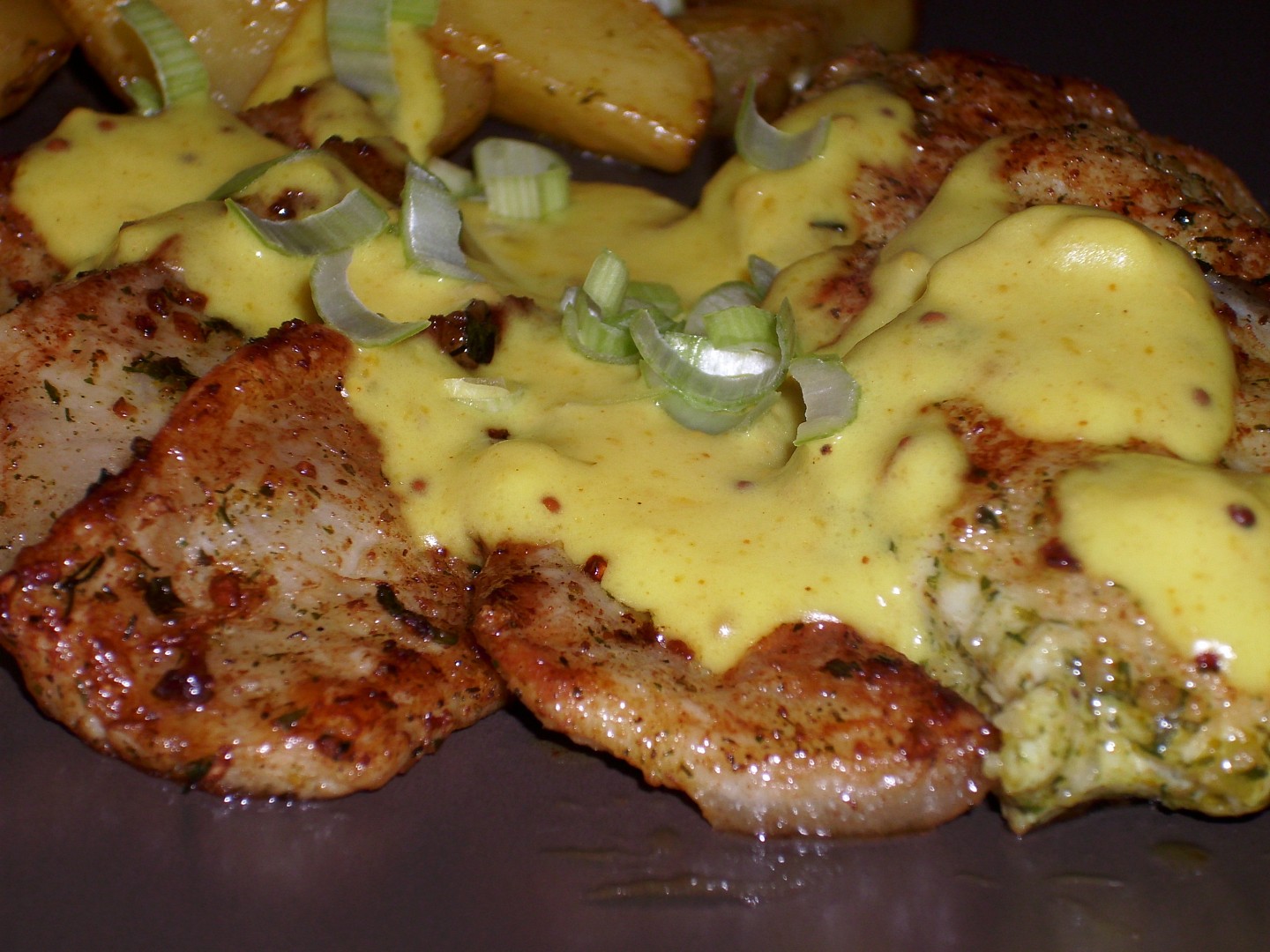 3. Vsypte kari koření – každý podle své chuti, já osobně dávám hodně, aby byla omáčka hezky žlutá. Smíchejte a přidejte smetanu. Pokud se vám bude zdát množství málo, můžete přidat trochu mléka nebo naředit vodou. Omáčka by měla mít konzistenci něco mezi tekutou a hodně hustou, takový zlatý střed. Dochuťte solí nebo polévkovým kořením.