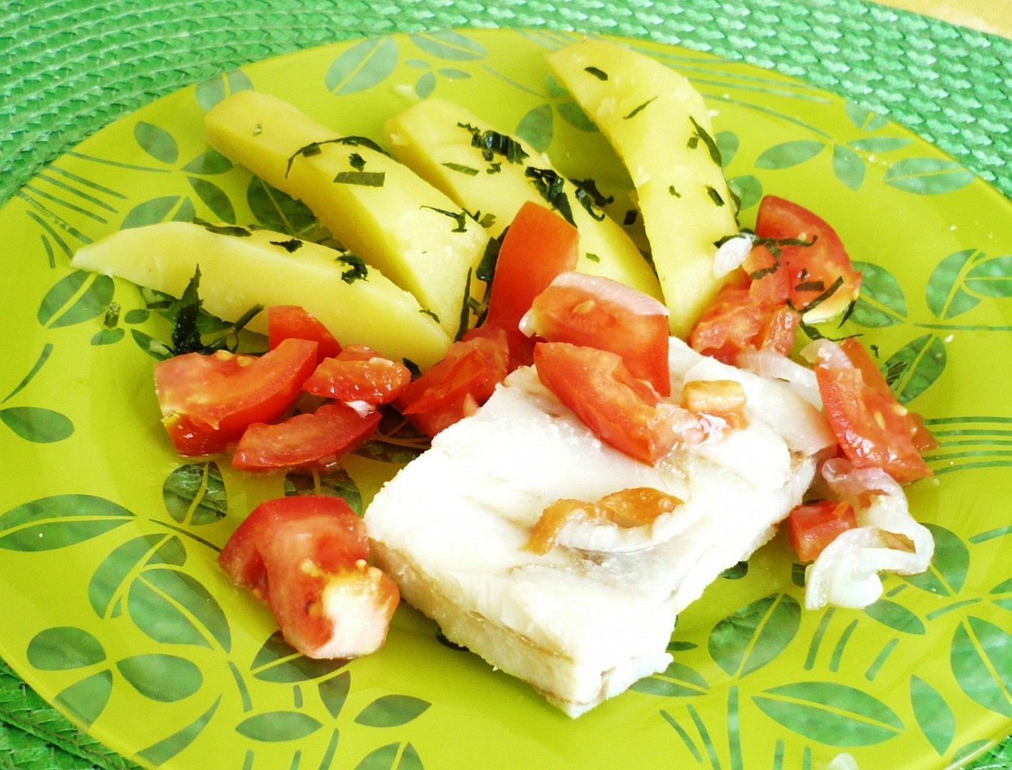 Na másle orestujeme cibuli nakrájenou na tenká půlkroužky. Přidáme osolenou a opepřenou rybu a dusíme do poloměkka. Potom vhodíme nakrájené rajče a vše společně dodusíme.