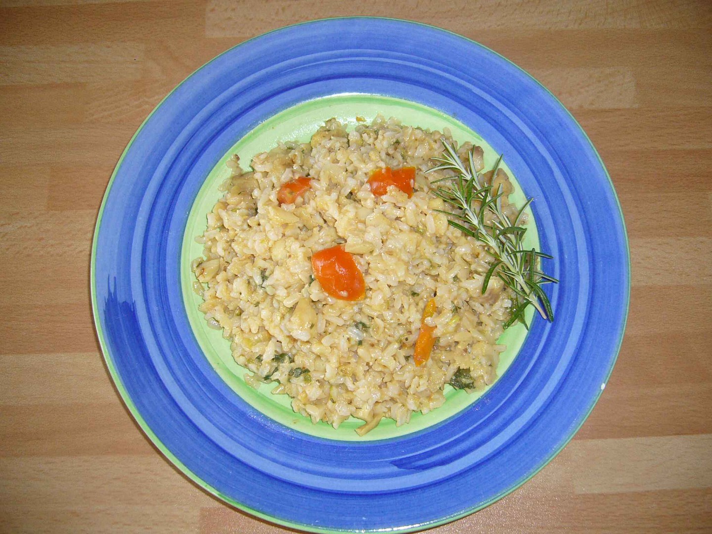 Uvařím rýži klasickým způsobem, do vody s rýži přidám snítku rozmarýnu (rýže natáhne vůni této bylinky). Pokud v rýži zůstane pár lístečku rozmarýnu, nevadí, zbytky rozmarýnu pak vyhodíme.