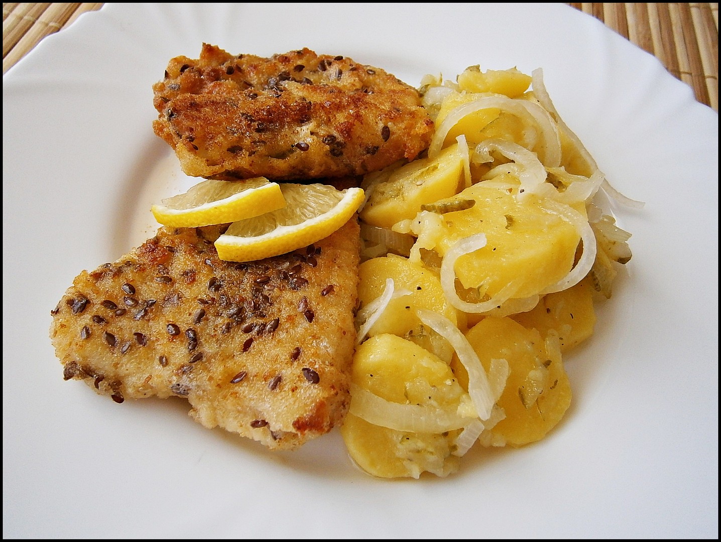 Osušené filety osolíme, překrojíme na menší díly, obalíme v mouce, vejcích a strouhance se semínkem.