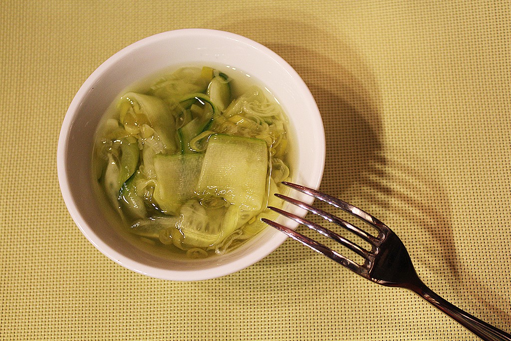 - 1/2 salátové okurky – nakrájíme na tenké pásky, nejlépe škrabkou na brambory