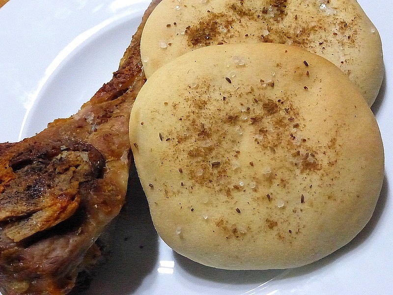 Potřeme vodou, posypeme kmínem a solí a upečeme ve vyhřáté troubě (200-220°C/13-17 minut).