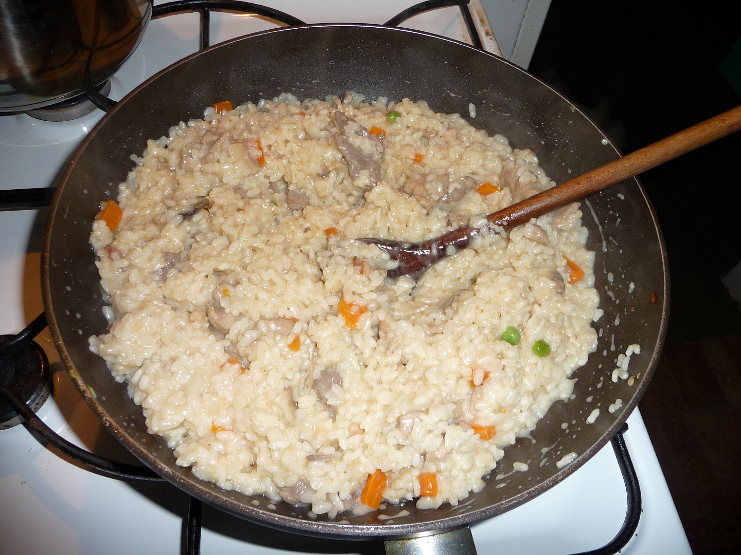 Přidáme rýži, podlijeme vývarem, promícháme a přiklopíme. Podlíváme vývarem do změknutí rýže, nakonec vmícháme nastrouhaný sýr. Necháme odležet a podáváme. PŘEJI DOBROU CHUŤ:-)