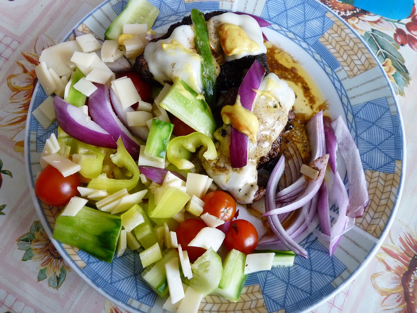 Tohle byla rychlovka jen pro mě, takže zelenina byla – co dům dal – placičky z mletého masa, prodává Albert jako novinku pod názvem hamburger. Takže je určitě možné to připravit i na grilu.