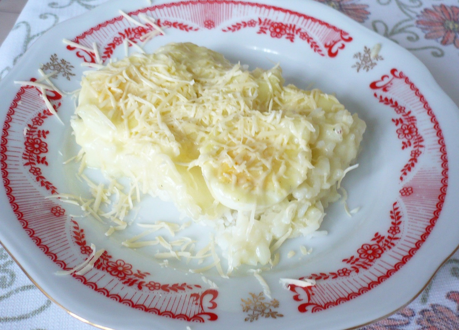 Do vymasteného pekáča navrstvíme ryžu, do nej jemne vtlačíme polovice vajíčok reznou stranou nahor a zalejeme bešamelom.