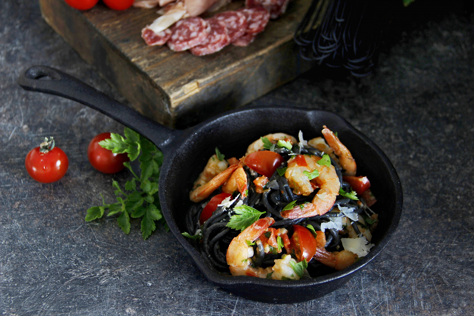 Na pánvi rozehřejte kousek másla s pár kapkami olivového oleje, přidejte česnek, krevety a promíchejte. Dejte pozor, ať se česnek nespálí, zhořkl by. Jakmile krevety začnou růžovět, přimíchejte rajčata, osolte a už jen prohřejte. Krevety nesmíte restovat příliš dlouho, jinak budou tvrdé a gumovité. Nakonec přidejte petrželku, odstavte a vmíchejte uvařené špagety. Promíchejte a servírujte posypané sýrem.