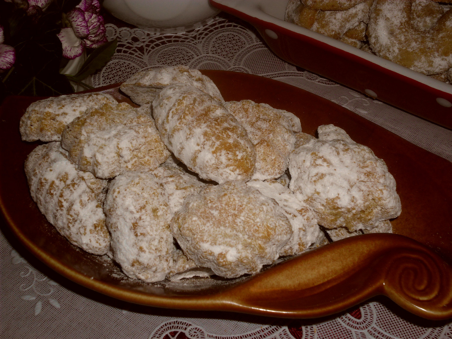 Potom nandáme do formiček a pečeme v předehřáté troubě dorůžova. Formičky nevymazáváme ! Při vyklepávání z formiček pozor, cukroví je velmi křehké a rádo se láme.
