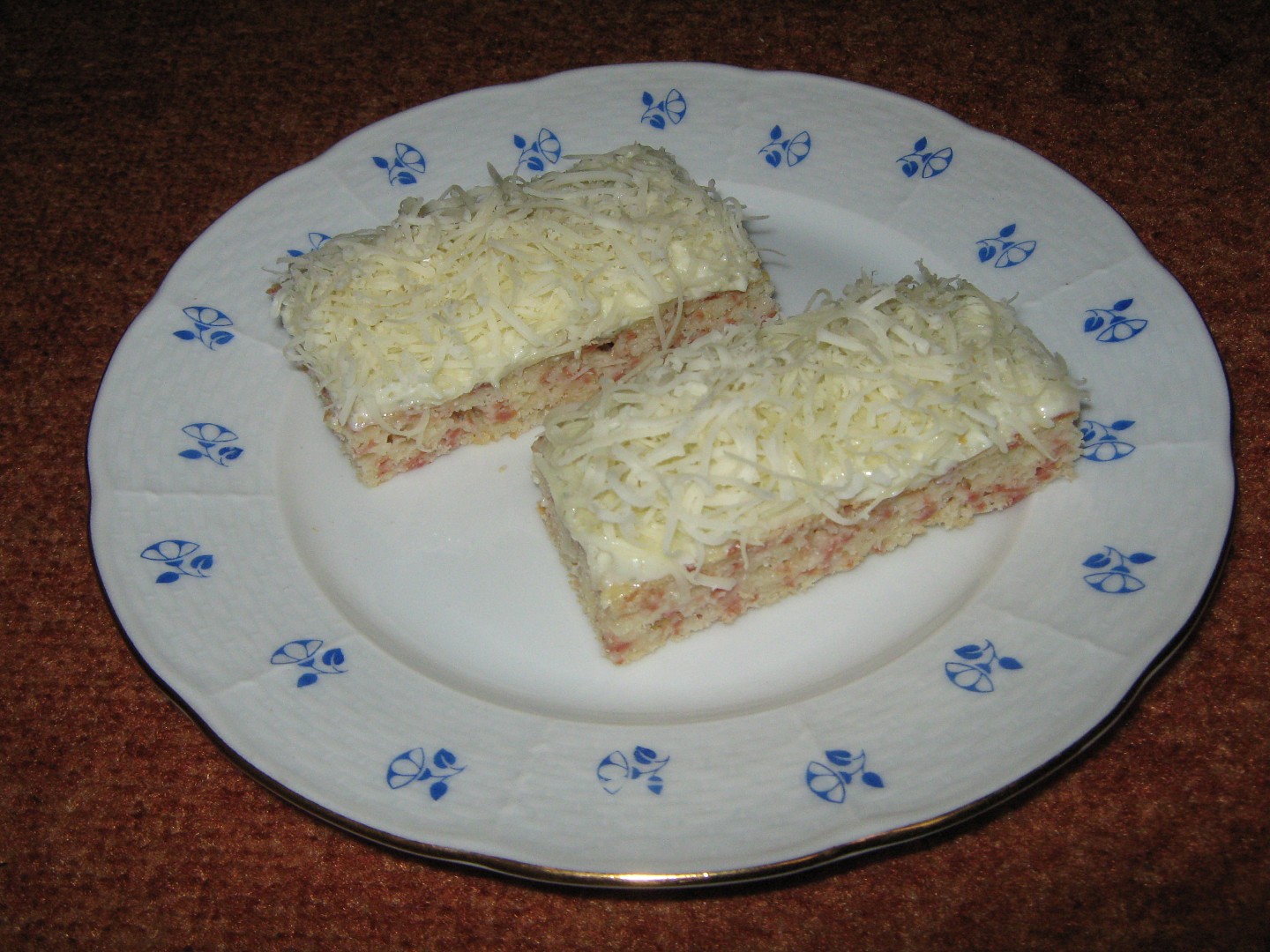 Připravený krém natřeme na korpus. Nakonec si nastrouháme eidam a posypeme krém, mírně přimáčkneme. Hotové řezy dáme do ledničky ztuhnout, alespoň na 5 hodin. Poté rozkrájíme a servírujeme.
