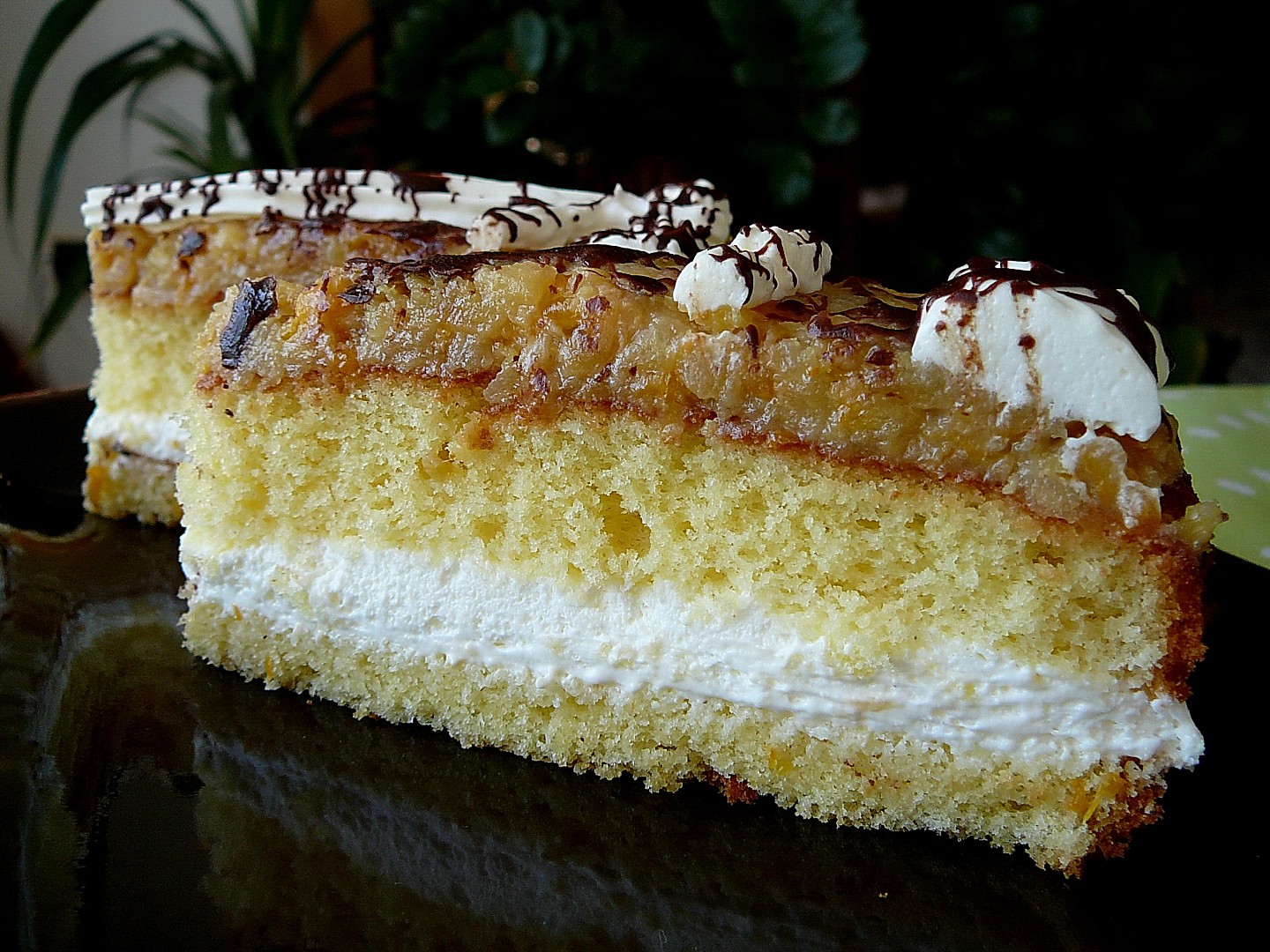 8. Vychladlý korpus jednou prořízneme, pokapeme citron. šťávou, potřeme šlehačkou a přiklopíme horní díl zpět. Mírně zatlačíme. Nahoru naneseme vychladlý ovocný krém (i když se Vám bude zdát krému hodně, dejte všechen – čím vyšší vrstva, tím lepší) a ozdobíme.vDáme vychladit do lednice. Minimálně na 3 hodiny, nebo přes noc – krém ztuhne hned, ale záleží, jak se Vám podaří našlehat šlehačku. Mě se moc nedařilo – použila jsem 40% místo oblíbené Cremefine a byla řidší, tak jsem krájela až druhý den.