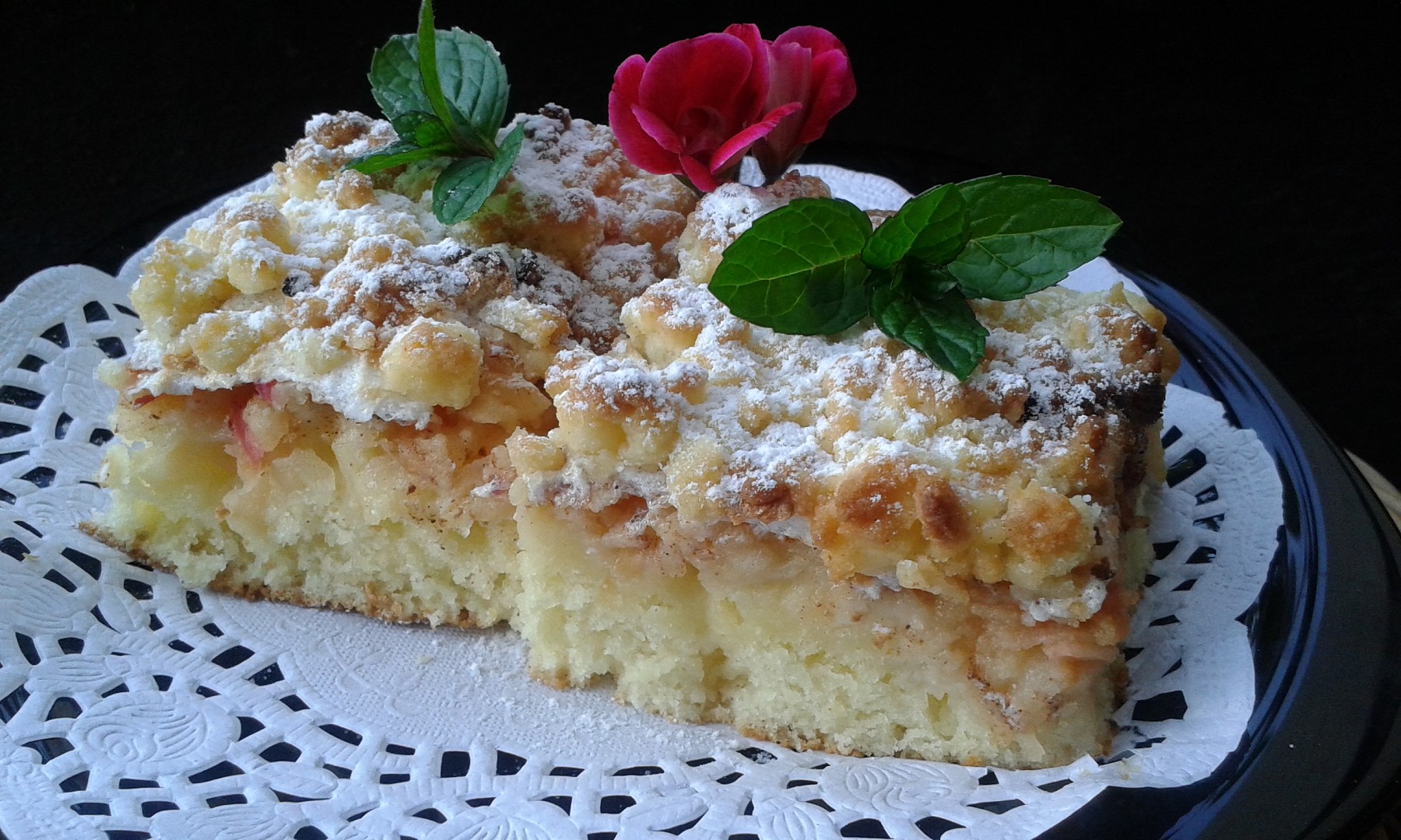 Nachystáme plech s pečícím papírem. Těsto vylijeme na plech, poklademe jablky(pokud jsou moc šťavnatá vymačkáme větší část šťávy), posypeme skořicí s cukrem a nahoře drobenkou. Pečeme v předem vyhřáté troubě na 180°C cca 30-35 minut.