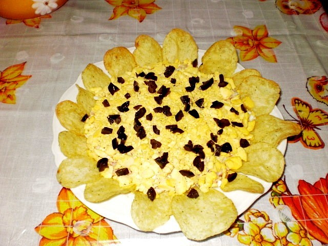 Insipirovala jsem se tímto receptem:http://www.toprecepty.cz/recept/8952-salat-slunecn…, ale protože jsem neměla žampiony, udělala jsem podklad slunečnice z našeho oblíbeného salátu. Děkuji za nápad, jemuž tento salát získal netradiční úpravu.