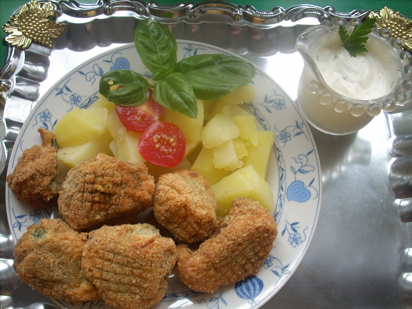 Příloha vařené brambory a tatarka.