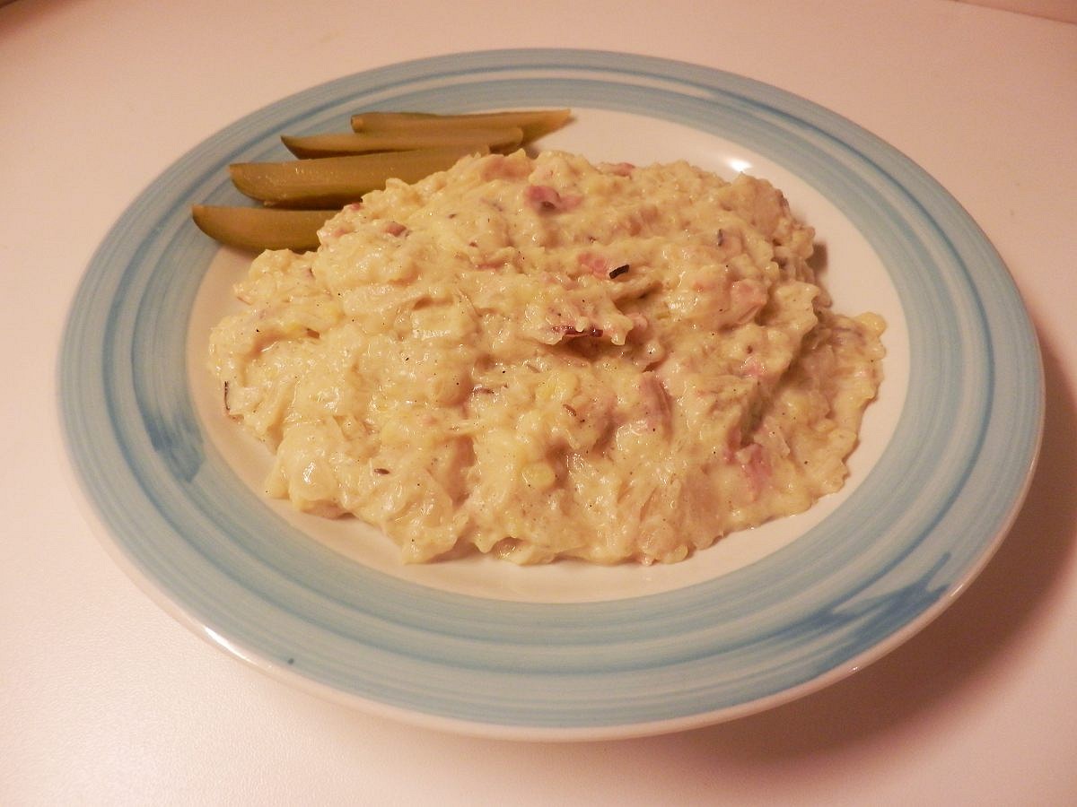 Současně na další pánvi lehce osmahneme na kostičky nakrájenou anglickou slaninu a vmícháme ji k zelí i s oloupanými, šťouchanými bramborami. Opět necháme cca 10 min pod pokličkou a za stálého míchání přidáme zakysanou smetanu. Lehce povaříme, můžeme podle potřeby podlít vodou či vývarem. Dle chuti osolíme, opepříme.