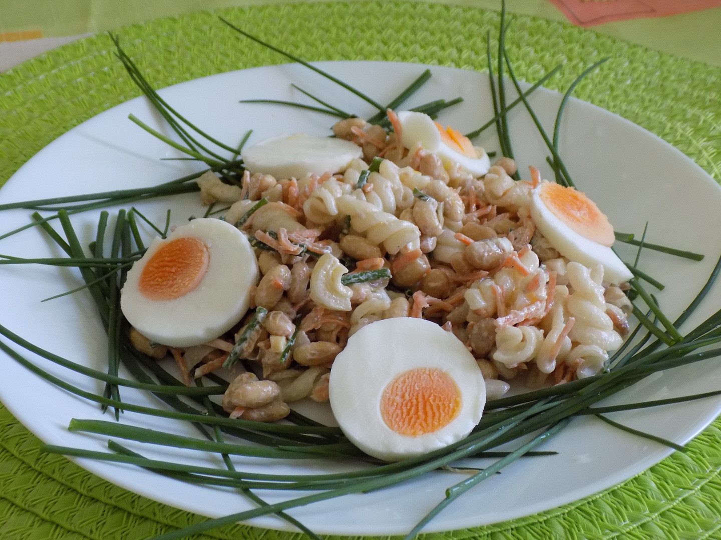 Zmiešame sóju, cestoviny, nastrúhanú mrkvu, nadrobno nakrájanú cibuľu a pažitku.