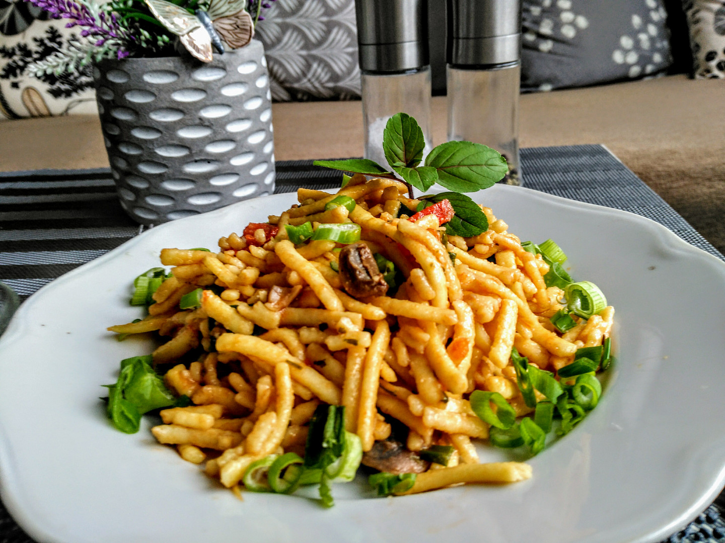 Houbovou směs s paprikami a rajčaty smícháme s uvařenými špeclemi a jemně pokrájenými bylinkami.