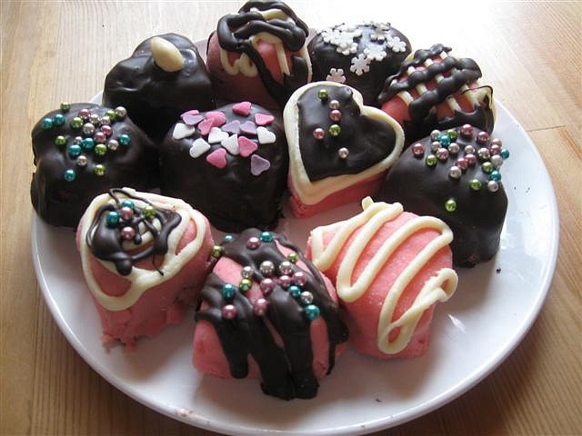 6. Dle fotografií potáhneme srdíčko marcipánem. Pracujeme vždy s vychlazeným dortíčkem, jinak se to špatně potahuje. Zdobíme jak chceme nebo jen polejeme čokoládou.