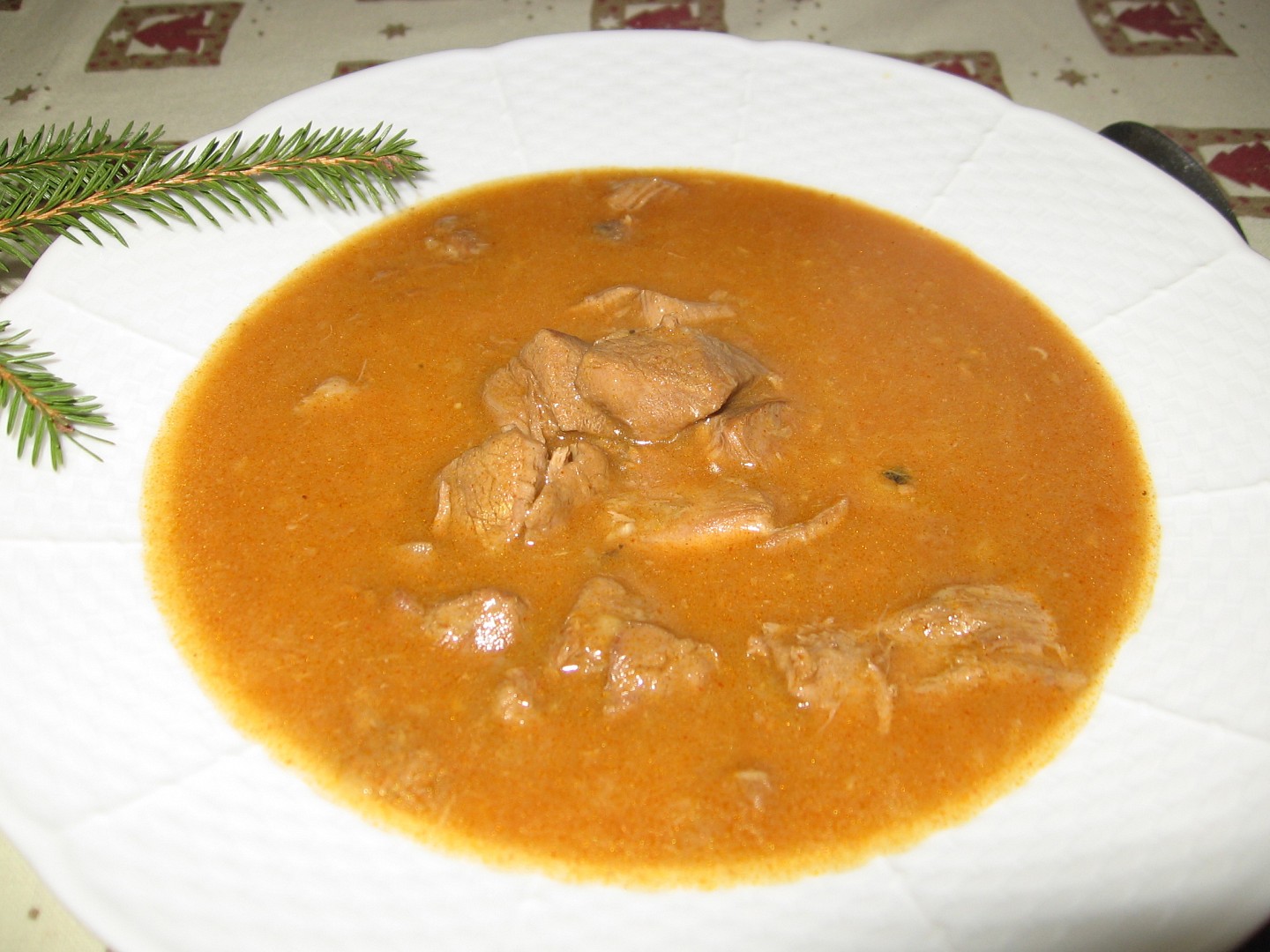 Maso omyjeme, nakrájíme na kostky. Na sádle zpěníme cibulku, přidáme jemně osolené maso. Osmahneme, aby se zatáhlo a posypeme paprikou. Promícháme, podlijeme vodou, přidáme nové koření, kmín, pepř a dusíme do úplného změknutí.