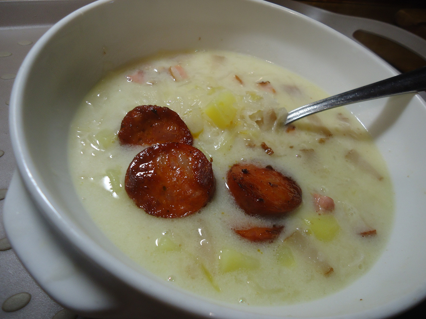 Když jsou zelí i brambory měkké, přelijete brambory i s vodou k zelí, zahustíte jíškou (nebo záklechtkou) a povaříte dohromady ještě tak 10 minut. Podle chuti dosolíte, event. dosadíte. Z pánve pak přidáte i osmaženou slaninu s cibulí. Nakonec – už mimo zdroj tepla – vmícháte smetanu. Pokud chcete, můžete přidat na kolečka nakrájenou a opečenou pikantní klobásu.