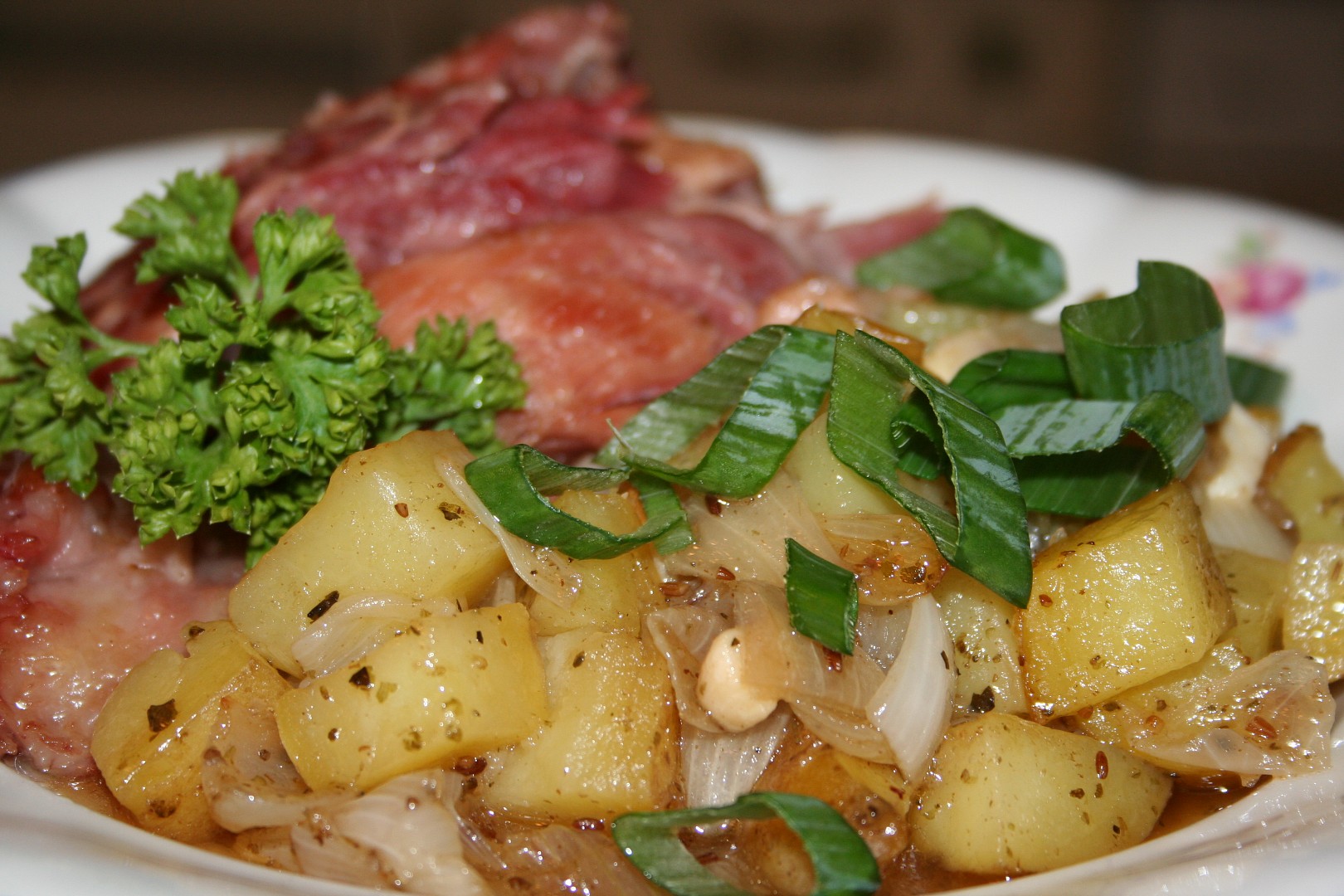 Neoloupané brambory a cibuli nakrájíme na stejně velké kostičky, přidáme na plátky nakrájený česnek, kmín a rozemnutou majoránku, osolíme, dobře promícháme a vsypeme na dno zapékací misky.