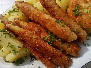 Obalený chřest v trojobalu smažíme v rozpáleném oleji ze všech stran dozlatova.